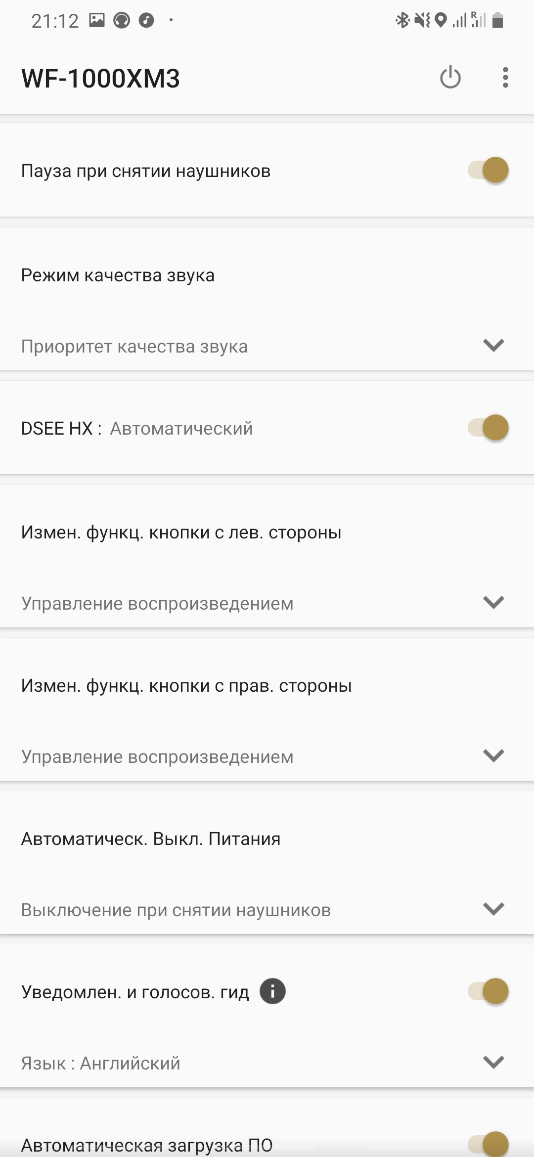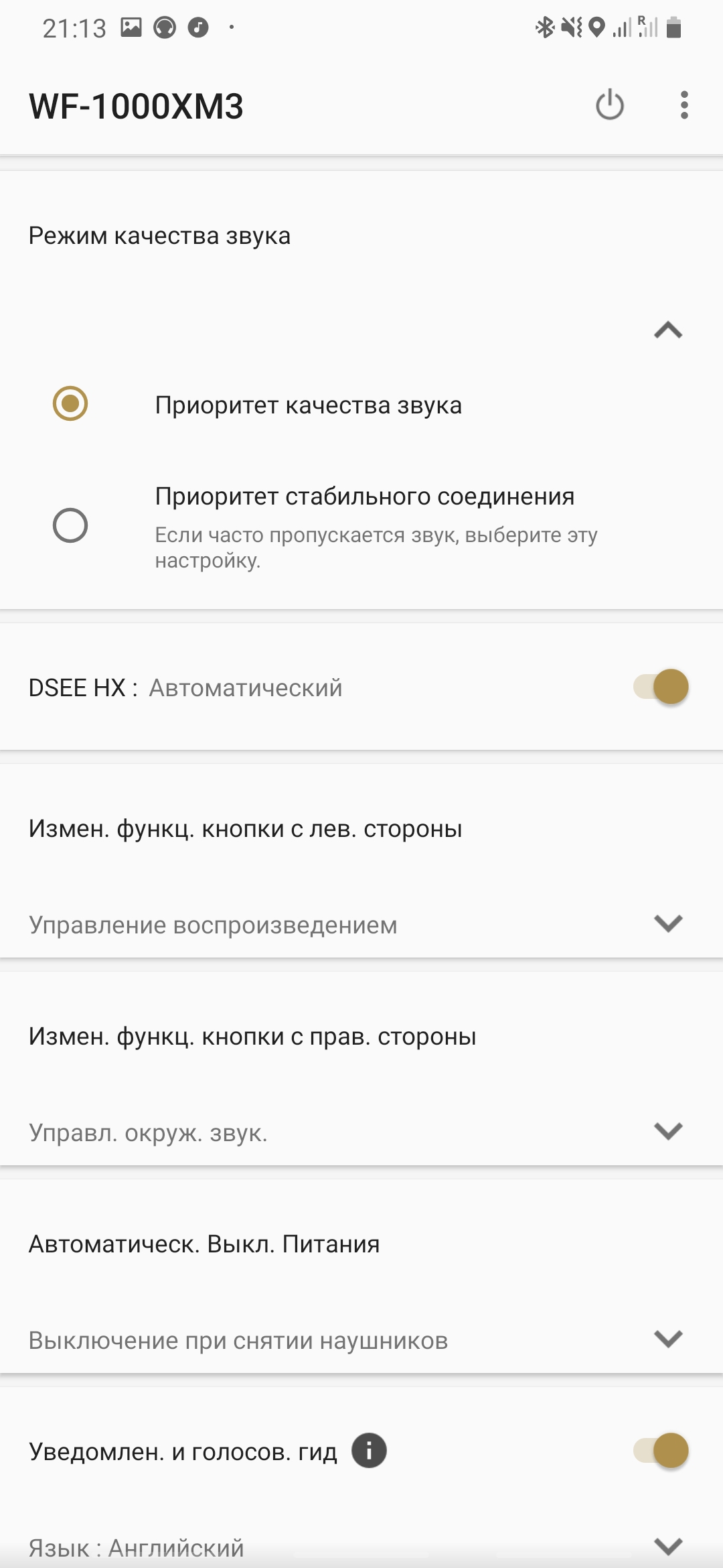 Par défaut, le WF-1000XM3 fonctionne avec la réduction du bruit et les boutons tactiles des deux côtés contrôlent la lecture. Pour mettre en pause / démarrer la lecture - un clic, pour faire avancer la piste - deux, en arrière - trois pour appeler l'assistant intelligent (en passant, Samsung, par exemple, propose deux choix, Google et Bixby) - appuyez longuement. Si vous retirez l'écouteur de votre oreille, la lecture s'arrêtera, mais vous pouvez la démarrer manuellement (ou vous pouvez annuler cet arrêt dans les paramètres de l'application). Soit dit en passant, si vous obtenez les deux, la musique sera à nouveau jouée et jouera jusqu'à ce que vous l'éteigniez ou que vous la masquez dans un boîtier.