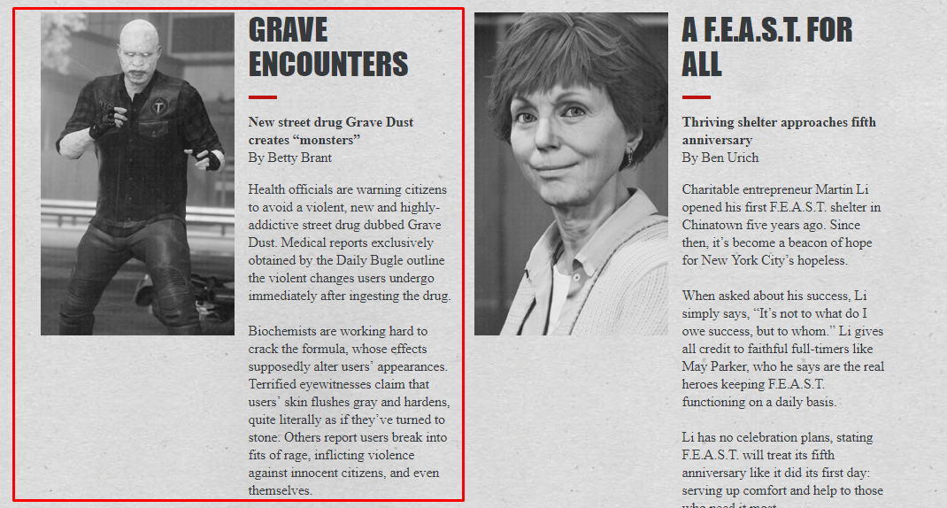 Ресурс разместил Daily Bugle Issue #2, в котором журналистка вселенной Marvel Бетти Брант (Betty Brant) рассказывает о новом наркотике. В заметке говорится, что Могильная Пыль (Grave Dust) отбеливает кожу человека и делает ее грубой, «как будто превращая в камень».