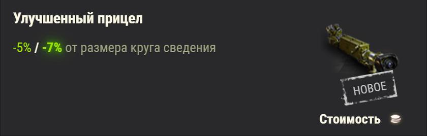 Думаете, что у вашего танка точное орудие? Прибавьте к показателю разброса 25% и вы узнаете насколько оно может быть кривым. Полезность «Улучшенного прицела» сложно оценить, так как точность орудия зависит от элемента случайности. С другой стороны, оно и снижает влияние этой самой случайности. Наиболее актуально на танках с крупнокалиберными орудиями, где высока цена промаха.