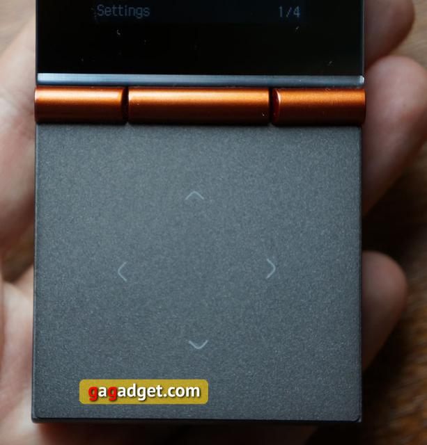 Из кнопок у плеера есть три больших, медного цвета, под экраном и плоская крестовина-навигатор. Она кажется сенсорной, но на самом деле это обычные кнопки с неглубоким и довольно жестким ходом. Звук регулируется кнопками под экраном, кроме средней — она служит для включения/выключения и блокировки устройства. Переход по меню осуществляется с помощью крестовины, клавиши назад нет. А она не была бы лишней: так, передвигаясь по столбцам эквалайзера, справа налево я пытаюсь нажать на левую стрелку, но, из-за логики устройства, выхожу в более общее меню.