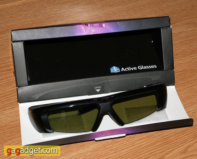Для просмотра 3D-видео вам понадобятся специальные очки. 3D-телевизоры Samsung работают с активными очками затворного типа, которые управляются непосредственно с телевизора. Стёкла попеременно «открываются» и «закрываются» 60 раз в секунду (общая частота обновления при этом составляет 120 Гц), а телевизор при этом попеременно отображает картинку для правого и левого глаза. Единственный минус такой конструкции заключается в том, что все источники света в комнате при этом начинают немилосердно мигать, поэтому просмотр 3D-видео необходимо производить в полной темноте. Очки не входят в комплект поставки телевизора. Их стоимость составляет порядка 100 долларов.