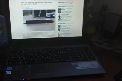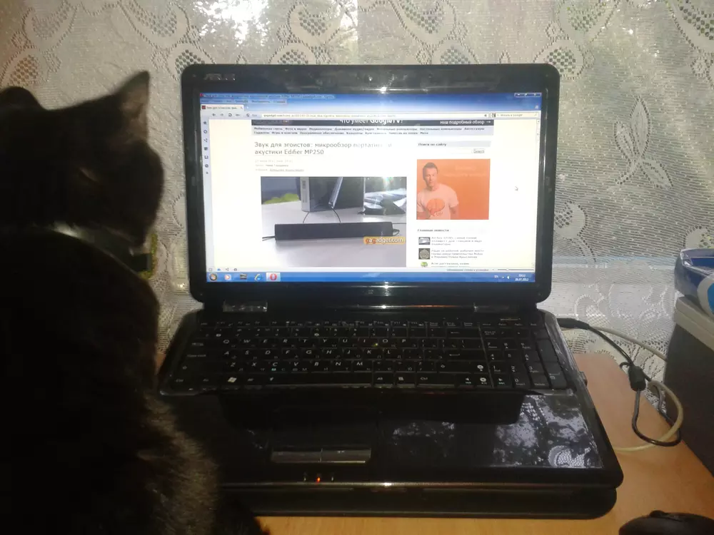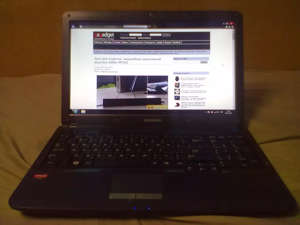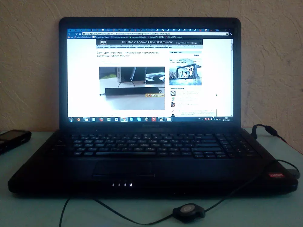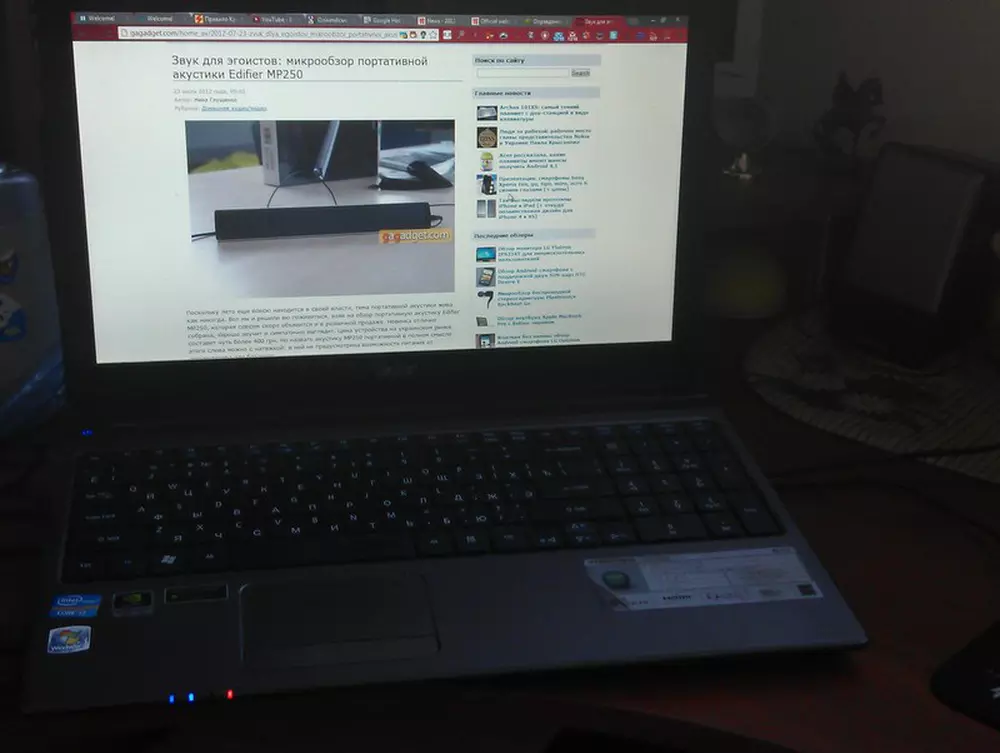 Фотография ноутбука со включенной страницей микрообзора портативной акустики Edifier MP250.