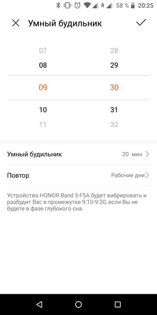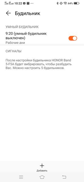 В браслете есть “умный будильник”, который можно настраивать с промежутком в определенное время. Например, вам надо проснуться в 9:00, но будильник может сработать на 20 минут раньше, если фаза сна будет подходящей. Но при этом он срабатывает даже тогда, когда пользователь уже давно проснулся и даже ходит, бегает и т.д. Если честно, я не замечаю пользы от таких будильников, поэтому не могу оценить качество работы. Мне показалось, что он срабатывал в одно и то же время, иногда на 10 минут позже.