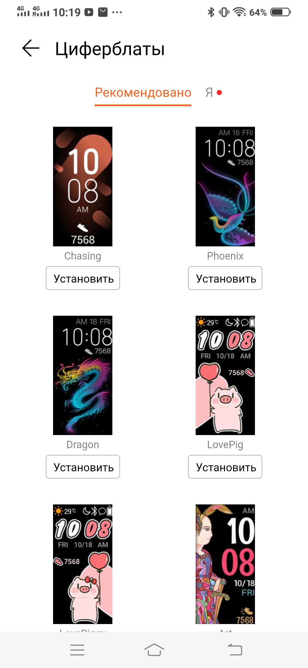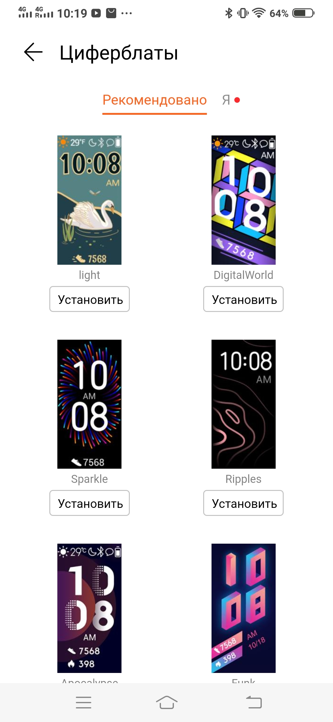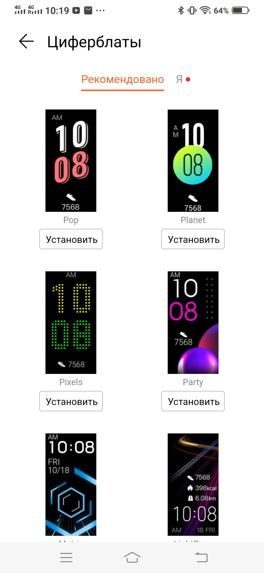Цвета сочные, циферблатов в меню браслета восемь штук, есть те, что только время показывают, есть - шаги, потраченные во время активности калории, расстояние. Но если этого мало, в приложении - еще несколько десятков, хотя они скорее про дизайн и фан, чем про утилитарность.