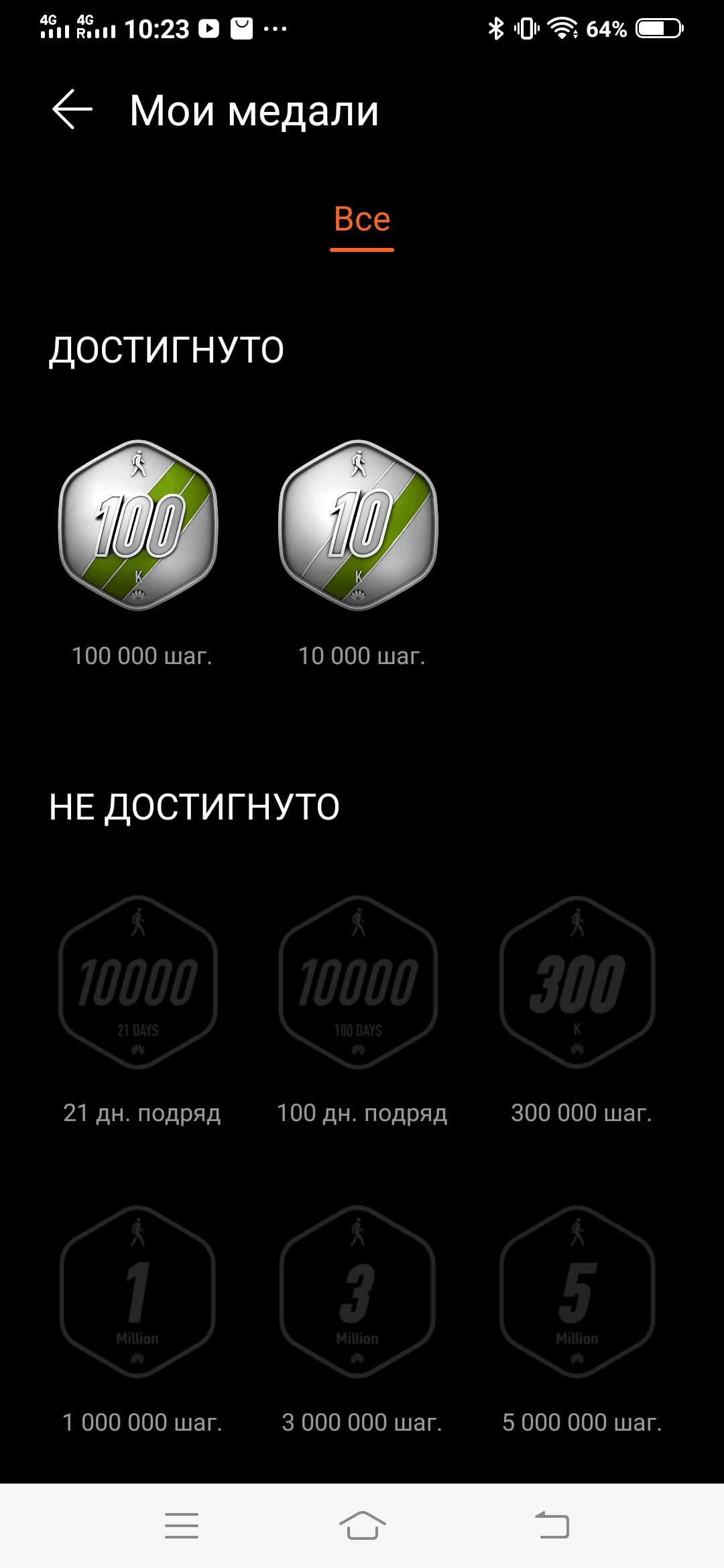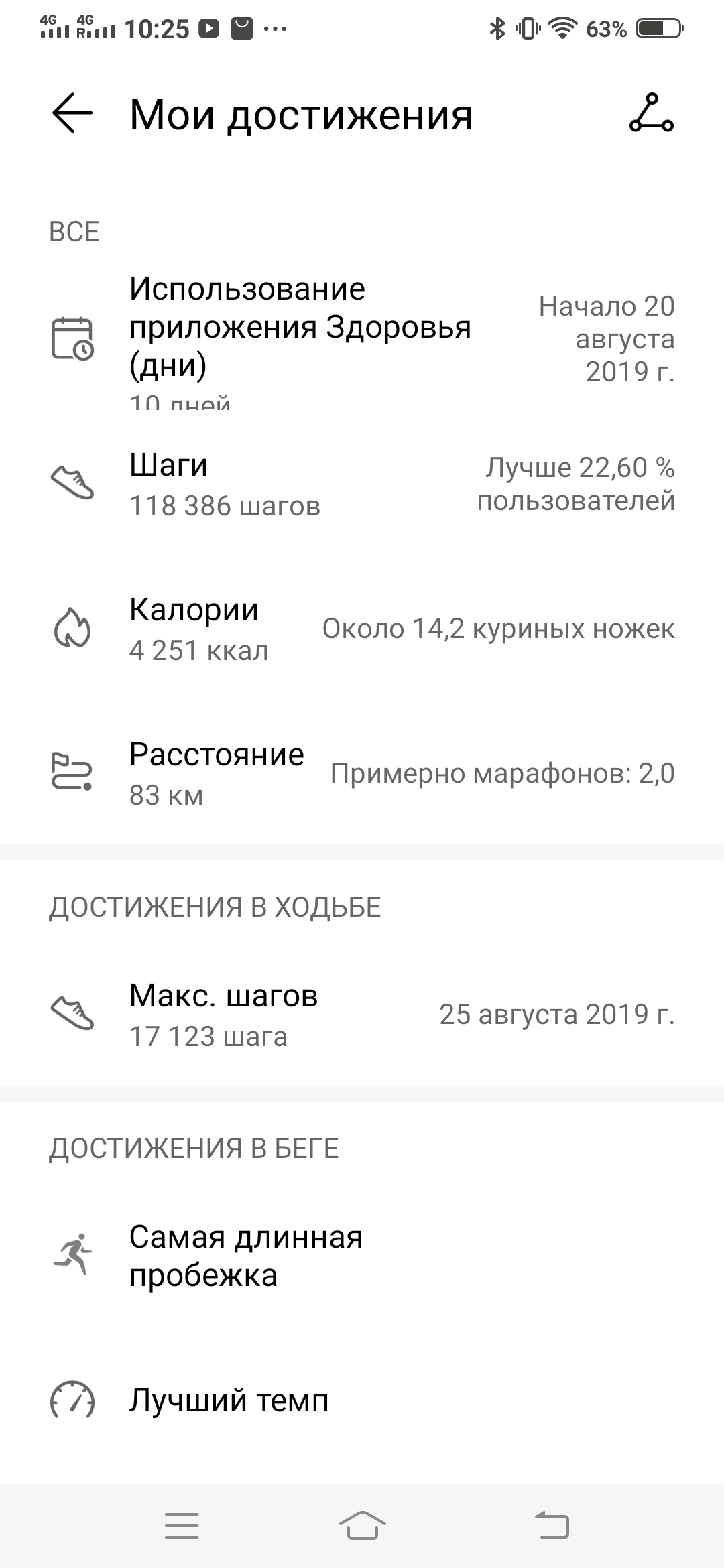 В меню приложения есть раздел с медальками - для тех, кому своей мотивации не хватает. Причем получить некоторые - задача на уровне практически невыполнимых. Марафон или супермарафон, например. Или поездка на велосипеде 100 км. В разделе “Мои достижения” показана вся статистика, которую собрал браслет. С удивлением узнала, что дней за 10 сожгла калорий на “14,2 куриных ножек”. Интересная единица измерения, жаль, что слишком абстрактная.