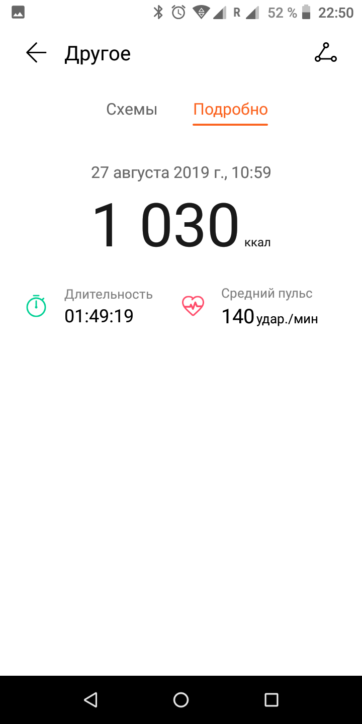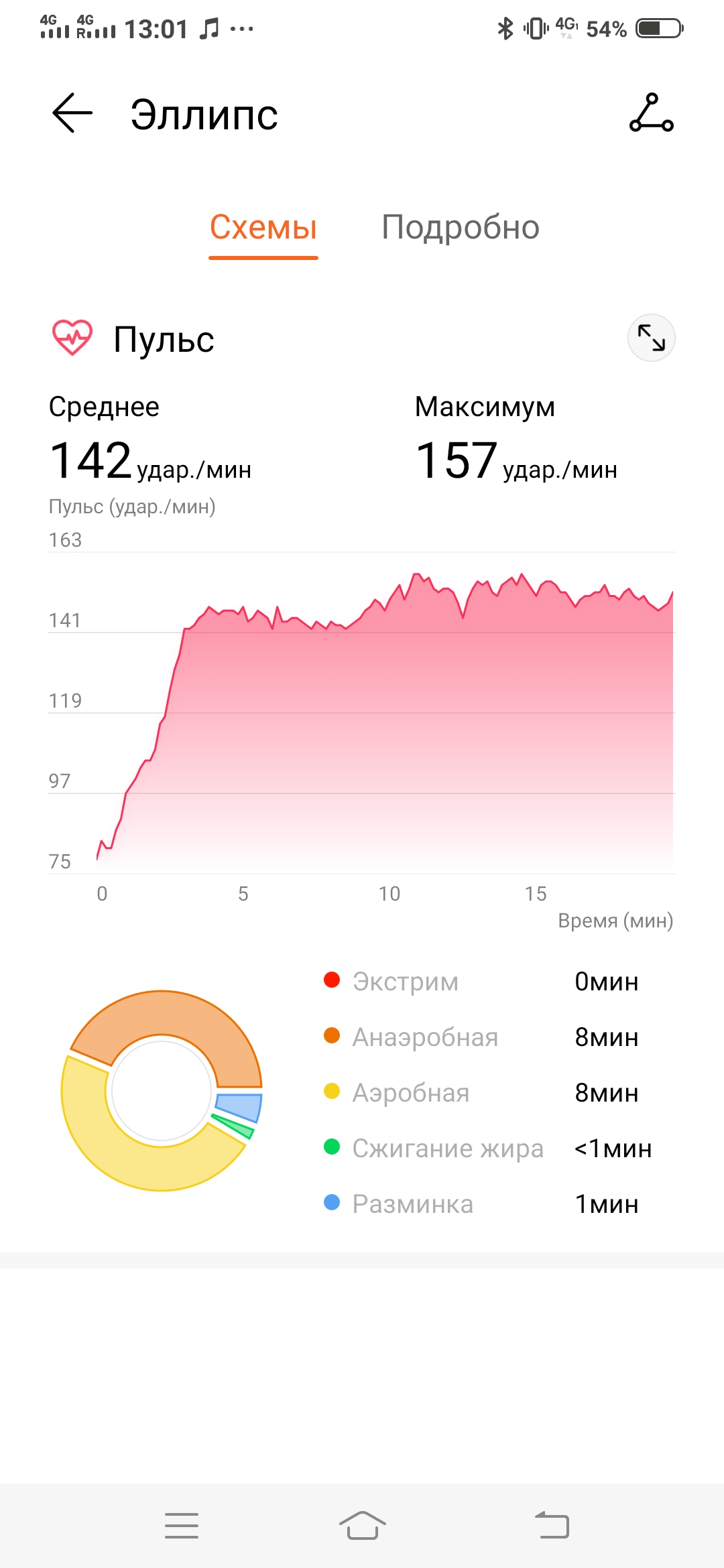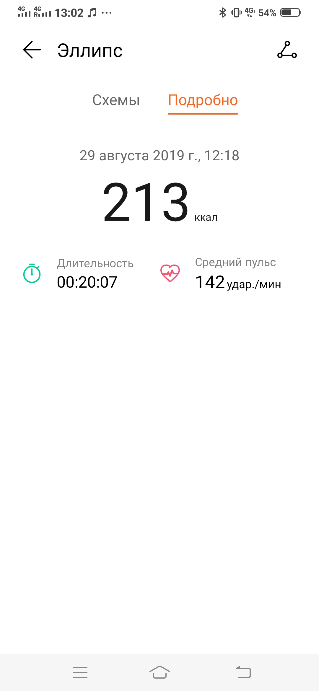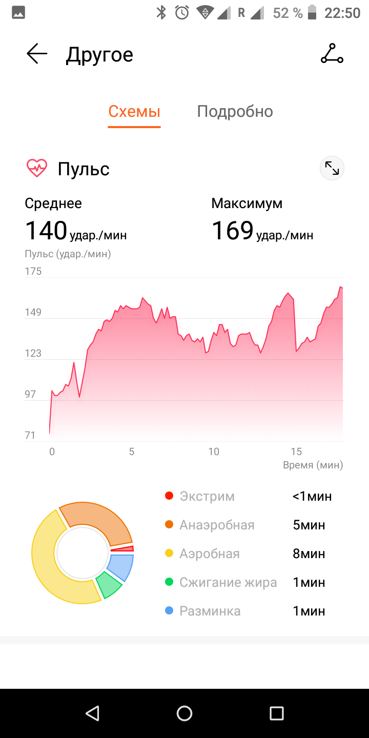Honor Band 5 оснащен 6-осевым датчиком движения. Он распознает девять видов спорта: бег на улице и на дорожке, ходьбу на улице и еще какой-то вид ходьбы, которому не нашлось подписи в интерфейсе, велотренажер, орбитрек, гребной тренажер, плавание в бассейне (кстати, выдерживает погружение на глубину до 50 м) и свободную тренировку. При этом в каждом из специфических видов спорта он трекает только пульс, продолжительность тренировки, сожженные калории и какие-то другие типичные мелочи. Детализация есть только для бега и ходьбы на улице. Там в приложении можно посмотреть среднюю скорость, среднюю частоту и длину шагов. В режиме орбитрека или гребного тренажера нет таких подробностей. Если забыли включить трекинг тренировки - ее можно добавить постфактум. Еще приложение дает подробный отчет о пульсе во время тренировки с разбивкой на пять режимов.