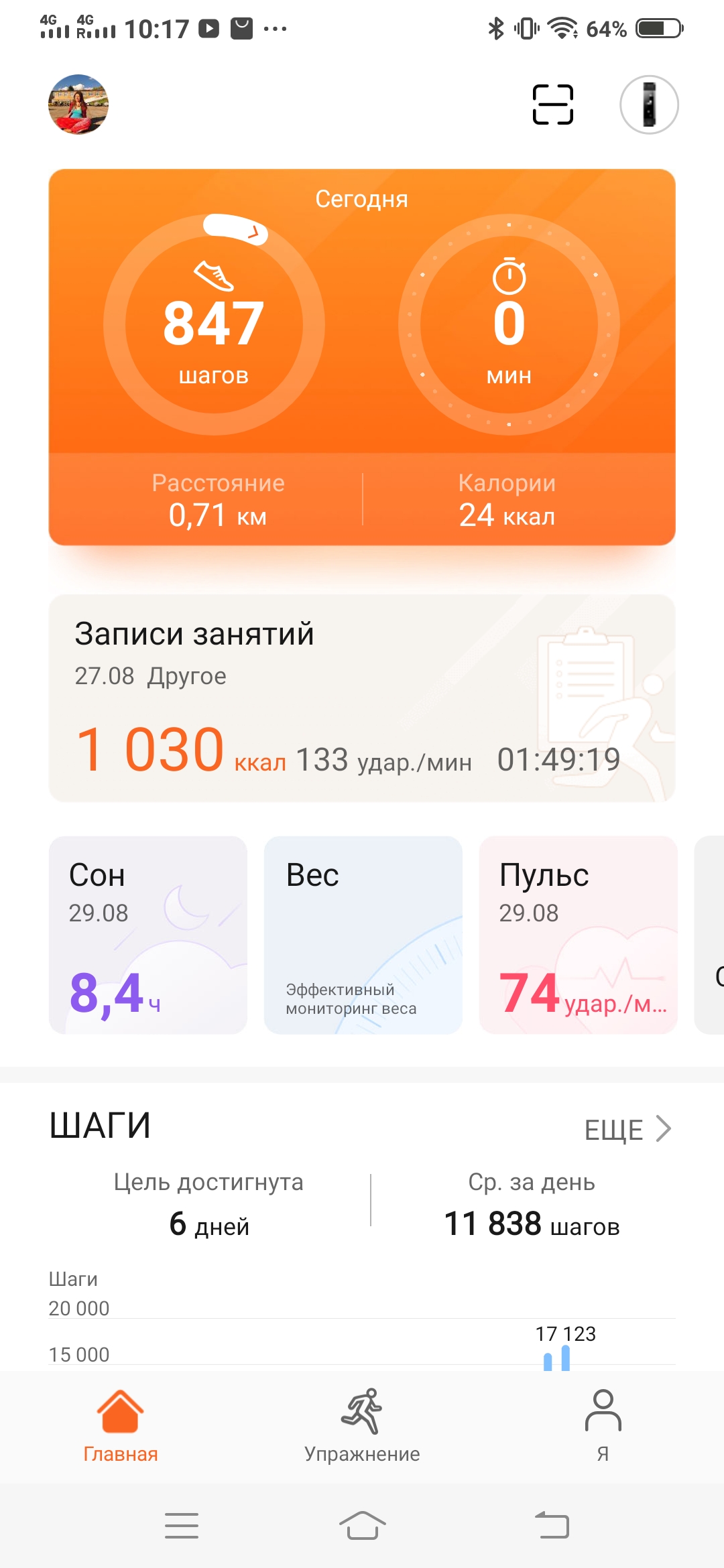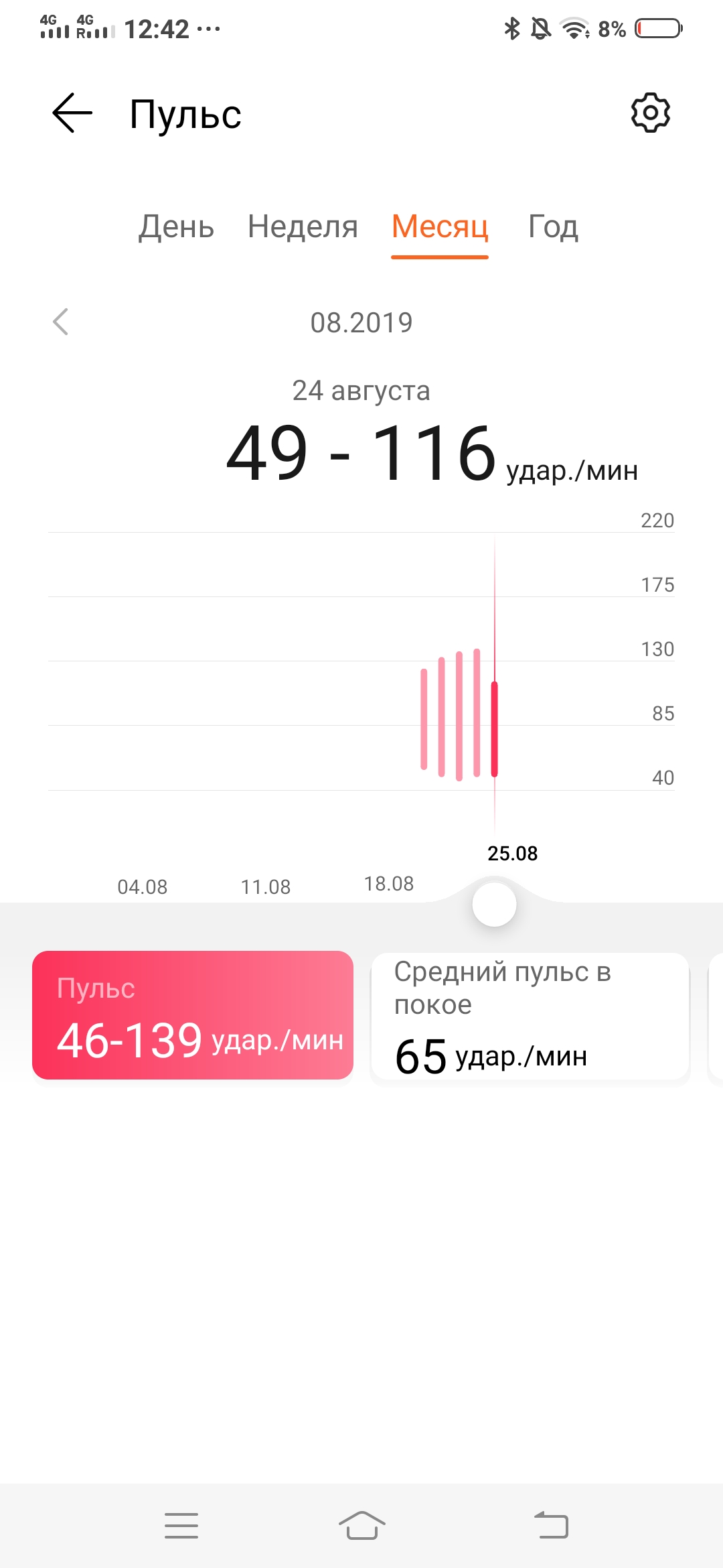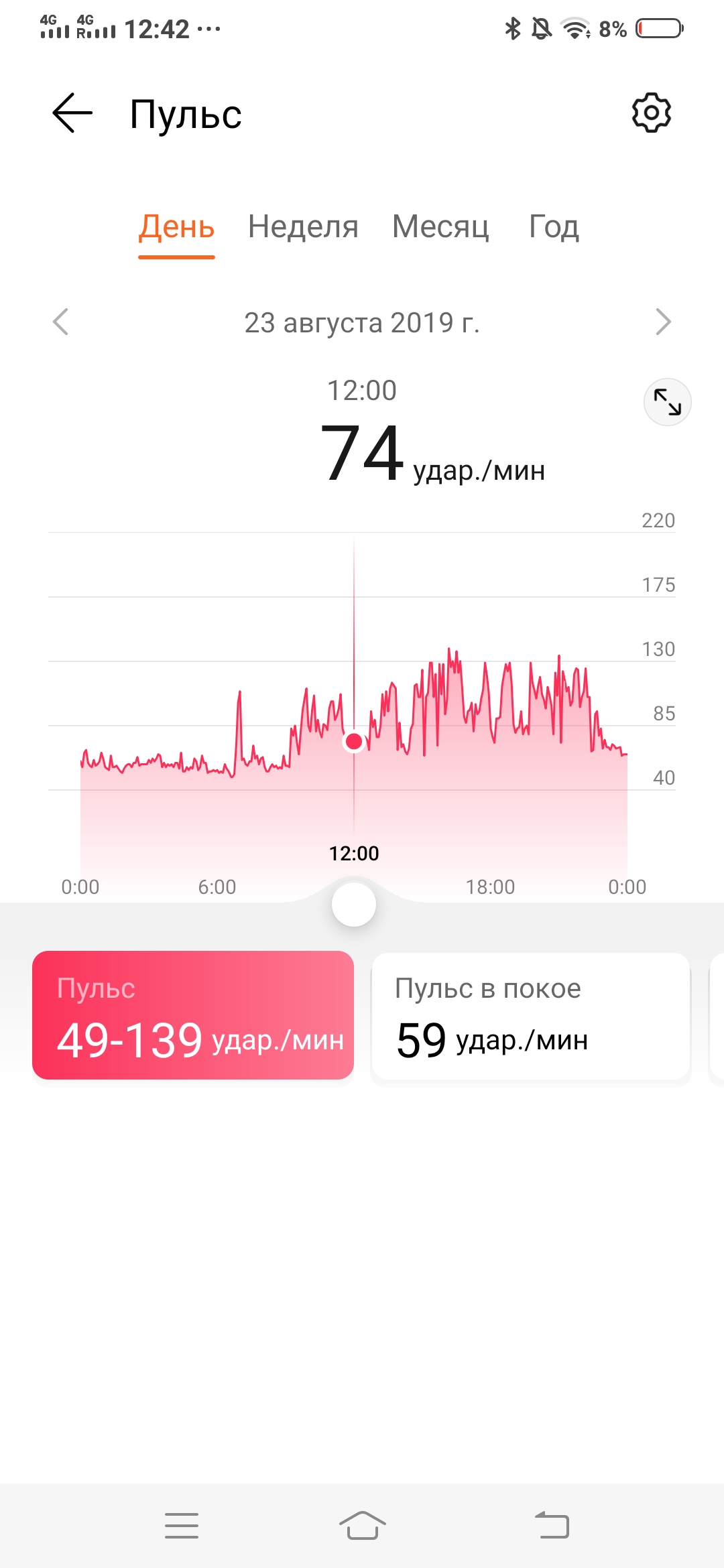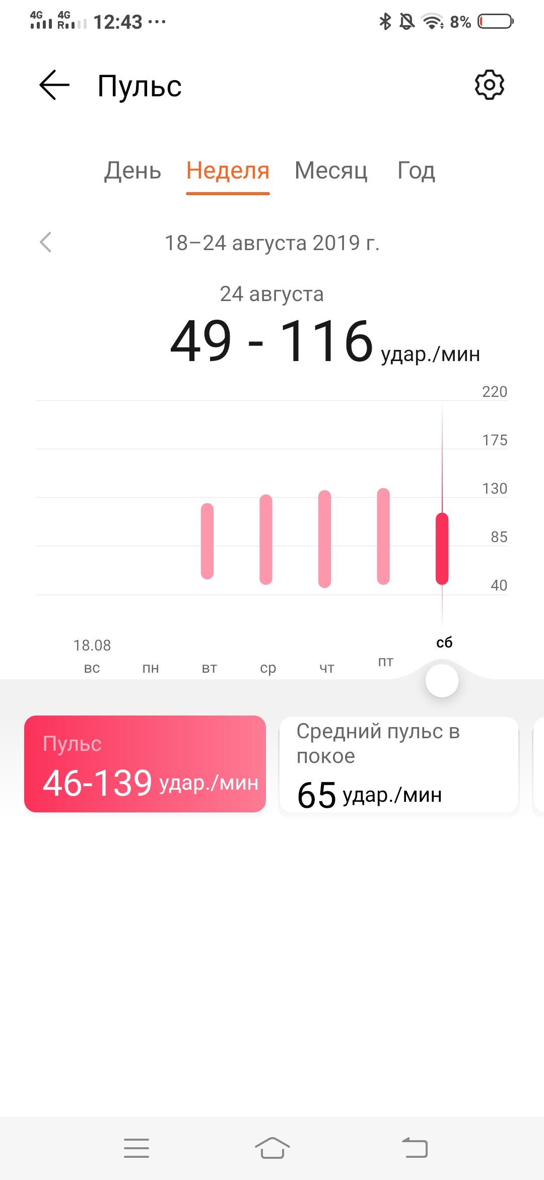 Honor Band 5 оснащен 6-осевым датчиком движения. Он распознает девять видов спорта: бег на улице и на дорожке, ходьбу на улице и еще какой-то вид ходьбы, которому не нашлось подписи в интерфейсе, велотренажер, орбитрек, гребной тренажер, плавание в бассейне (кстати, выдерживает погружение на глубину до 50 м) и свободную тренировку. При этом в каждом из специфических видов спорта он трекает только пульс, продолжительность тренировки, сожженные калории и какие-то другие типичные мелочи. Детализация есть только для бега и ходьбы на улице. Там в приложении можно посмотреть среднюю скорость, среднюю частоту и длину шагов. В режиме орбитрека или гребного тренажера нет таких подробностей. Если забыли включить трекинг тренировки - ее можно добавить постфактум. Еще приложение дает подробный отчет о пульсе во время тренировки с разбивкой на пять режимов.