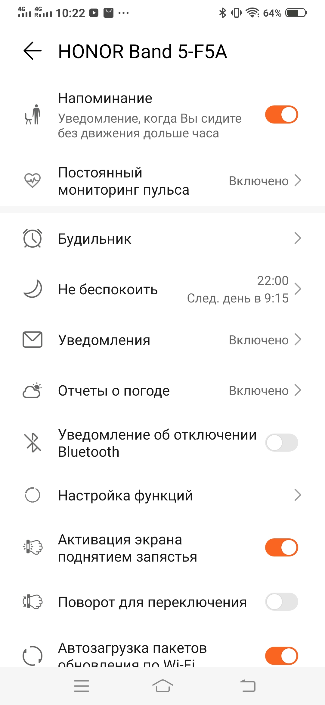 Кроме того, в меню браслета есть такие функции, как секундомер и таймер, в отличие от предыдущей модели, эта позволяет отсчитывать не только часы и минуты, но и секунды. С помощью Honor Band 5 можно искать телефон, просматривать уведомления со смартфона (приложения выбираются в настройках). Продолжительностью подсветки можно управлять также из меню устройства. А через меню приложения - включить напоминания о движении каждый час.