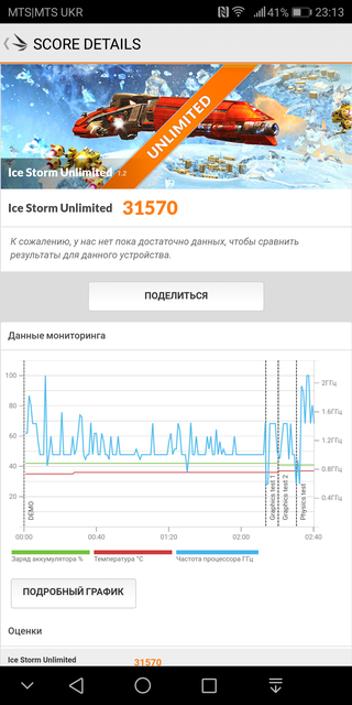 Питается смартфон от встроенного аккумулятора на 4000 мАч, поддерживается фирменная быстрая зарядка Huawei SuperCharge. С одной стороны, от неё смартфон заряжается за 30 минут приблизительно до 50%, но собственный стандарт обязывает использовать только фирменную зарядку. Время автономной работы приятно порадовало: с постоянной синхронизацией по 3G и Wi-Fi, социальными сетями, почтой, Youtube, играми, бенчмарками, фото и видео, смартфон у меня выдержал полтора дня. Дальше, уже при просто использовании (без прогонки тестов) получилось 2 дня. Плюс есть традиционные для Huawei режимы энергосбережения: