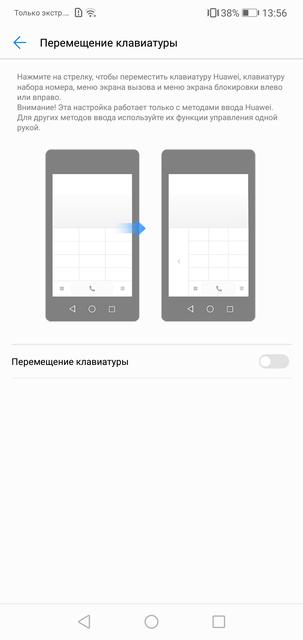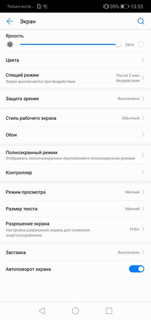 В смартфоне установлен 5.84-дюймовый LTPS IPS-экран HUAWEI FullView с соотношением сторон 19:9 и разрешением 2280х1080, так что при запуске приложений смартфон спрашивает, переключиться ли в полноэкранный режим с предупреждением о том, что не все приложения его поддерживают. На деле вылетал только XCOM: Enemy Within, в остальном проблем не было. Есть разные варианты разрешения: родное FullHD+ или HD+ и "умный" режим, в котором разрешение автоматически переключается для энергосбережения: