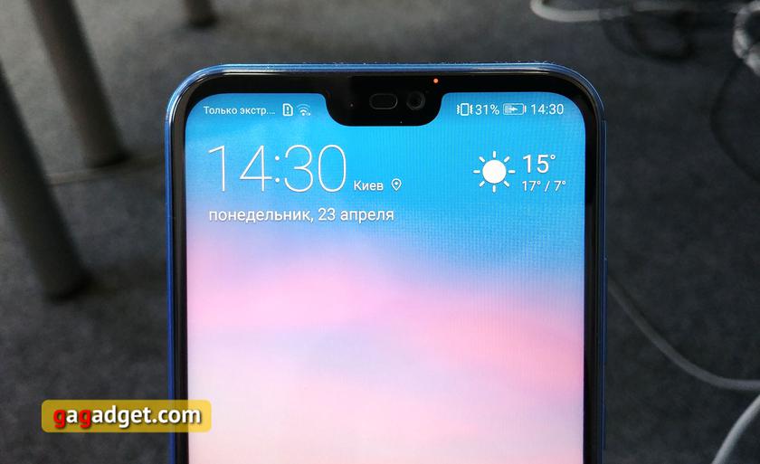 Вся линейка Huawei P20 сделана из стекла и металла и с первого взгляда отличить Huawei P20 Lite от старших моделей не так просто. Самым явным отличием является расположение сканера отпечатков пальцев: в старших моделях он под экраном, у Lite — сзади, а под экраном расположился логотип Huawei. Рамки по бокам от 5.84-дюймового дисплея очень небольшие, сам дисплей занимает около 80.5% фронтальной поверхности, он имеет соотношение сторон 19:9 и разрешение 2280х1080. Как и в старших моделях, в верхней части есть вырез. Его можно программно скрыть, в таком режиме на чёрном фоне будут отображаться иконки, либо оставить как есть. В вырезе разместили датчики, фронтальную камеру и разговорный динамик. Чуть правее — небольшой светодиодный индикатор уведомлений: