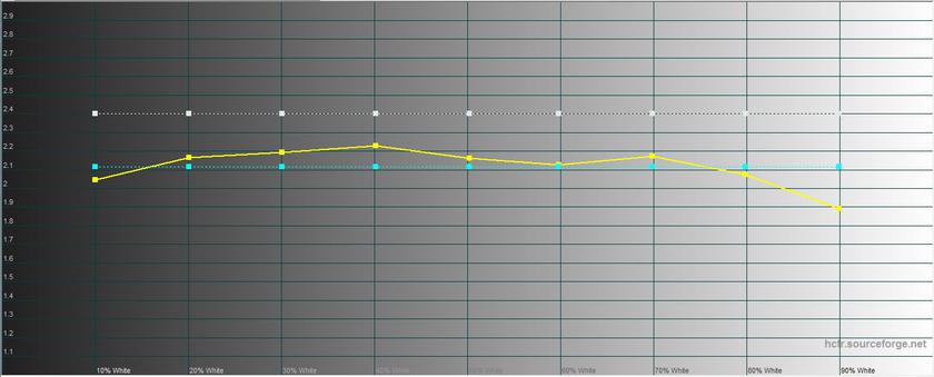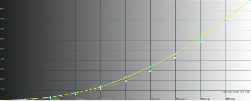В "Ярком" режиме максимальная яркость составляет 428.732 кд/м2. Цветовой охват типичный для OLED-панелей и ощутимо шире sRGB. По цветопередаче — есть небольшой переизбыток синего, в результате чего цветовая температура немного выше эталонной, 8000-8500К: