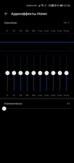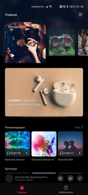 Звук у смартфона на среднем уровне. Как и в прошлом году, разговорного динамика в привычном виде нет, вместо этого звук "издаёт" сам экран. Реализация значительно лучше, чем в прошлом году: звук при разговоре чистый, громкости хватает. Но проблема с тем, что окружающие довольно неплохо слышат вашего собеседника осталась. И это лишило возможности реализовать стереозвук. Да, стерео нельзя назвать какой-то жизненно необходимой вещью, но практически все современные флагманы ею обзавелись. Единственный внешний динамик звучит громко и достаточно неплохо по качеству. Что же касается наушников, то разъёма 3.5-мм, разумеется, нет. Но работают любые переходники, звук в наушниках вполне приличный. Приложение плеера практически стандартное, с плейлистами, эквалайзером и прочим. Из необычного — он интегрирован с собственным музыкальным онлайн-сервисом Huawei Music. Если я правильно понял, он уже работает и у нас. Без подписки доступны различные плейлисты/радио по жанрам или назначению (к примеру для тренировок), по исполнителям — вероятно нужна уже платная подписка.
