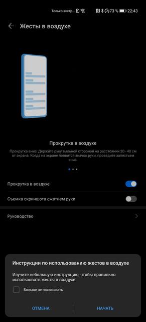 Конфигурация фронтальной камеры позволила добавить поддержку жестов в воздухе. Нужно поднять руку перед смартфоном и выполнить соответствующее действие. В теории — интересно, на практике — пока скорее игрушка. Поддерживается всего три жеста: прокрутка списка вниз/вверх и съёмка скриншота. Работает не слишком шустро и пользоваться этим постоянно не особо удобно. Возможно в будущих обновлениях добавят ещё жестов.