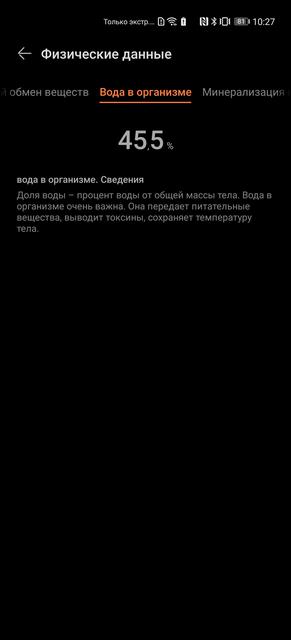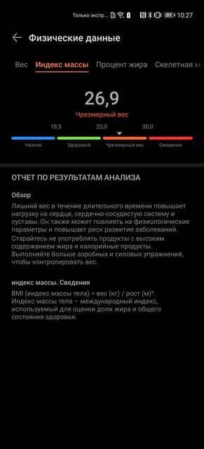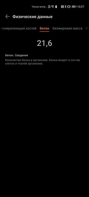 Теперь о том, что умеют измерять Huawei Scale 3. Весы оснащены алгоритмом Huawei TruFit. Как утверждает компания, алгоритм работает на базе Big Data и разработан в сотрудничестве с Институтом физических наук Хефея, а также Академией наук Китая. Всего измеряется аж 11 показателей: вес, пульс, отображение физического развития или индекс массы тела (ИМТ), процент жира в теле, отображение потери жира (обмен веществ), висцеральный жир, скелетная мышечная масса, вода в организме, минерализация костей, белок и безжировая масса. Всё это измеряется с помощью вышеупомянутой биоимпедансометрии и собственных алгоритмов. Прямо в приложении есть отдельные вкладки со "шпаргалками" о том, что это такое. Фигура напрямую зависит от процента жира в организме, а индекс базального метаболизма (при необходимых знаниях) поможет рассчитать дневной рацион и нагрузки. Данных весы предоставляют действительно много, но нужно иметь определённую базу знаний, чтобы их использовать эффективно. Смею предположить, что так много всего нужно далеко не каждому пользователю.
