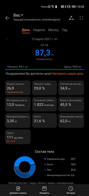 Стоит понимать, что Huawei Scale 3 — это не медицинский прибор и не стоит воспринимать полученные показания как предельно точные не стоит. Объективно проверить точность измерения можно только пару показателей: вес и пульс. С этим у Huawei Scale 3 всё в порядке. Погрешность по пульсу обычно не более 5%. Остальные же показатели — сказать сложно, но некоторые вызвали подозрение. Хотя стоит понимать, что с обновлениями все эти алгоритмы будут работать лучше и точнее. В целом, если вы планируете обстоятельно заняться своим телом и готовы изучить детально все измеряемые показатели для детальной проработки ежедневного рациона, тренировок и постоянно это всё отслеживать, то Huawei Scale 3 будут вполне полезны.