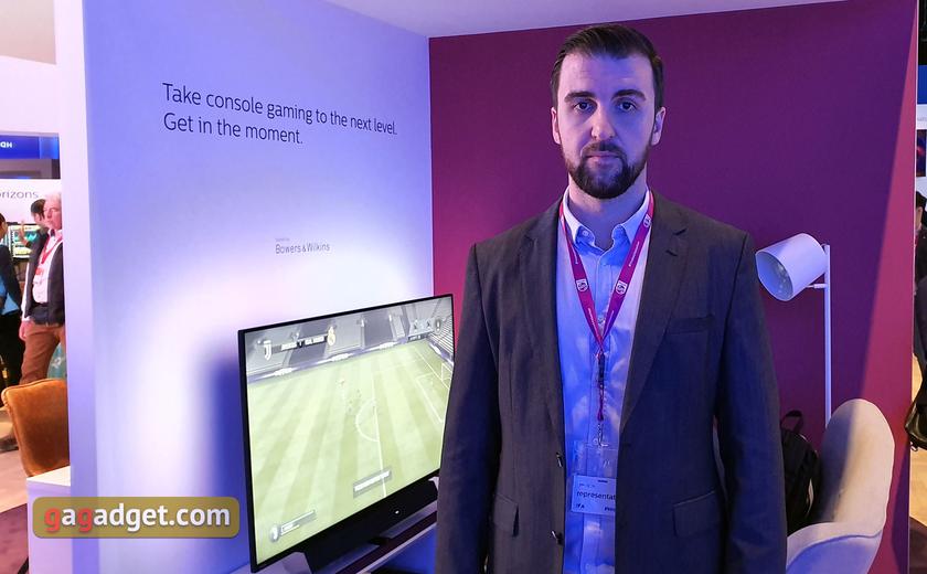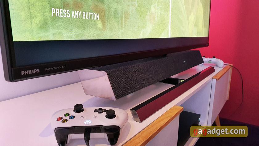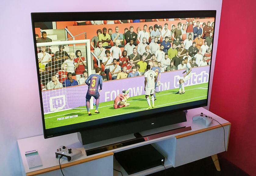 Philips прекрасно знает об относительно скором выходе консолей следующего поколения и Momentum как раз отлично для них подойдёт. Старшая 55-дюймовая Philips Momentum 558M1RY получила 10-битную матрицу UltraClear 4K с частотой обновления 120 Гц и сертифицикацией VESA DisplayHDR 1000. За звук отвечает саундбар, разработкой которого занималась компания Bowers&Wilkins. Оценить звук на выставке не удалось по понятным причинам, но, судя по габаритам, аудиосистемы будет более, чем достаточно для игр и фильмов.