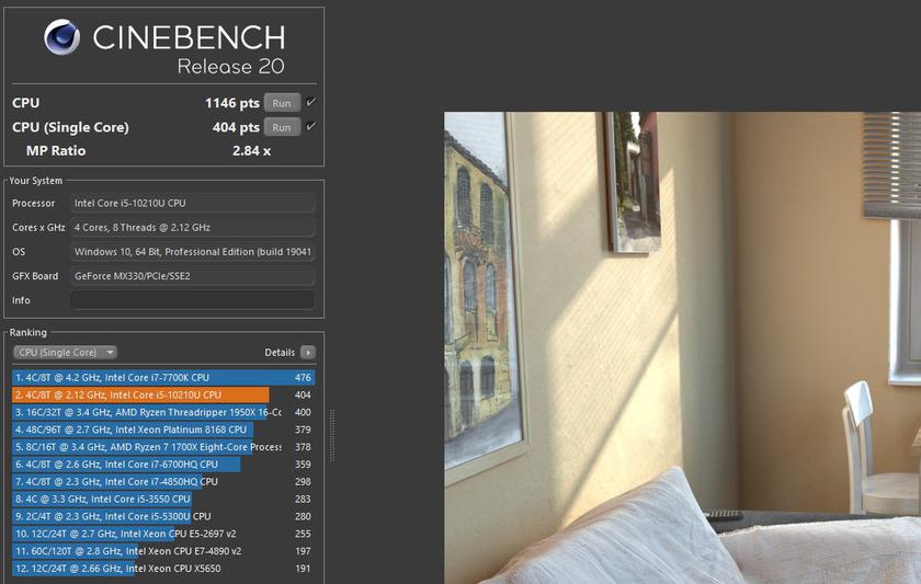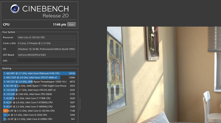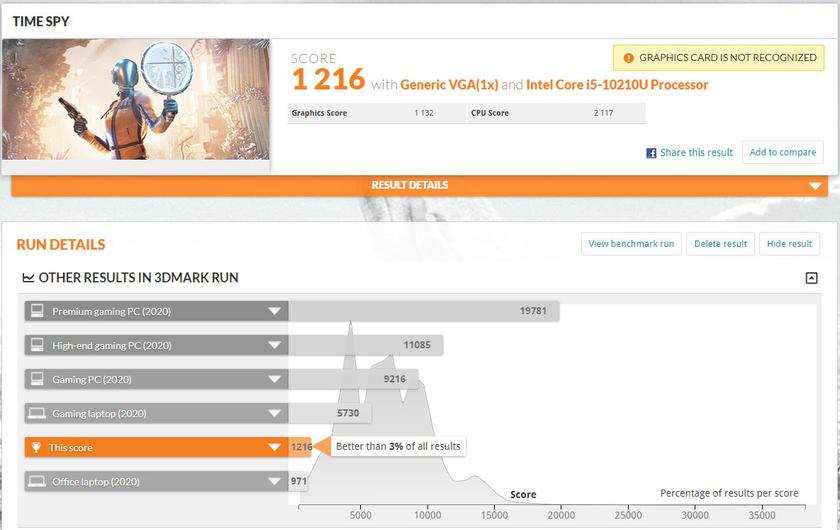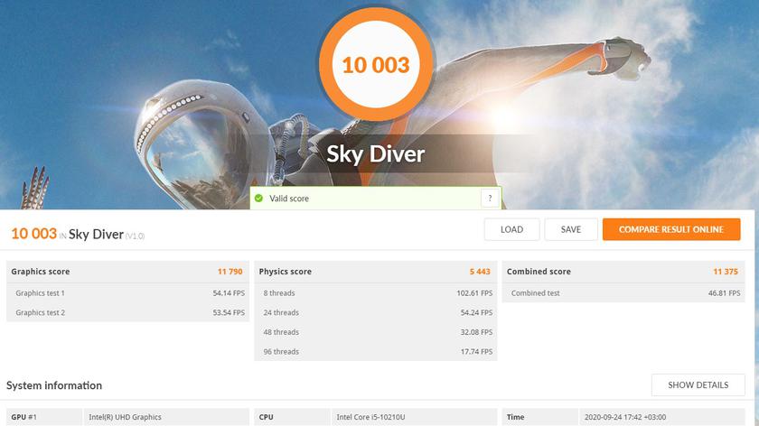 С точки зрения среднестатистических рабочих задач ноутбук справляется отлично: браузер с кучей вкладок, документы, Photoshop работают без каких-либо проблем. Для тяжёлой графики, разумеется, стоит смотреть другие варианты. Что касается бенчмарков, то Intel Core i5-10210U вполне бодро себя демонстрирует в процессорных тестах. В графических тестах ноутбук, ожидаемо, показывает скромные результаты, чуть выше "типичных офисных" ноутбуков.