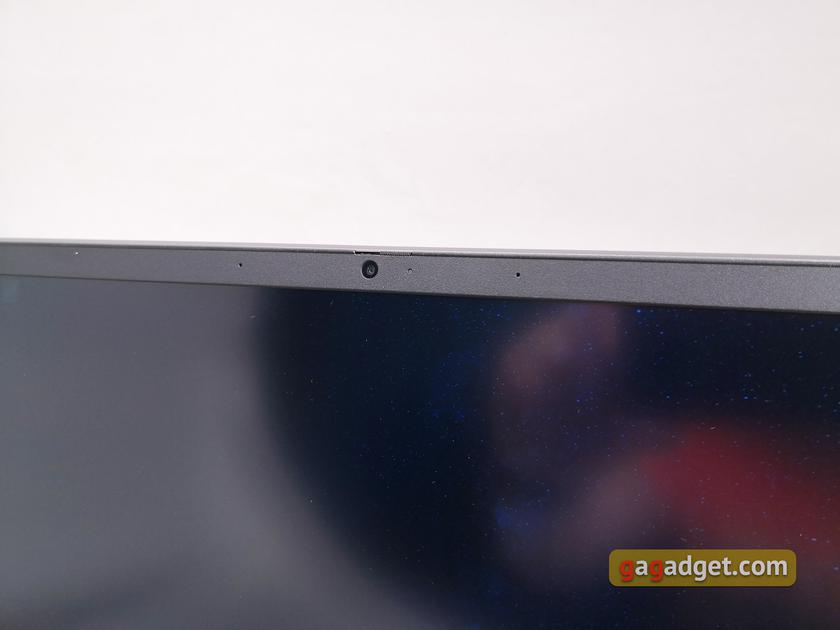 Рамка по бокам от экрана очень узкая, но зазоры сверху и (особенно) под дисплеем широкие. Немного странно, учитывая, что веб-камера с микрофонами и светодиодом находится на привычном месте. Камера оснащена механической шторкой ThinkShutter. Для тех, кто считает, что Большой Брат следит за всеми: