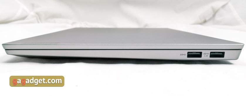 Толщина корпуса не рекордная, но это позволило установить полноразмерные разъёмы. Справа есть 2 порта USB 3.1, один из которых может быть всегда включён для зарядки мобильных устройств. С этой стороны вполне логичным был бы кардридер, но его в ноутбуке нет: