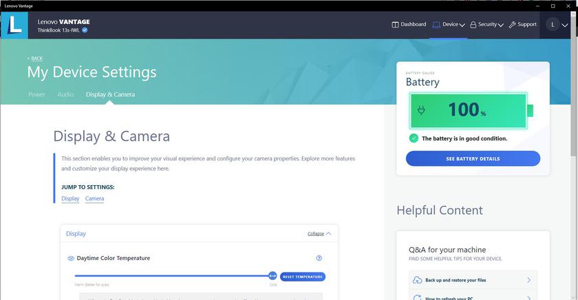Из дополнительного ПО стоит отметить Lenovo Vantage. В приложении можно посмотреть текущее состояние ноутбука, есть обновление драйверов, настройка питания, СО, USB для зарядки мобильных устройств, дисплея и так далее: