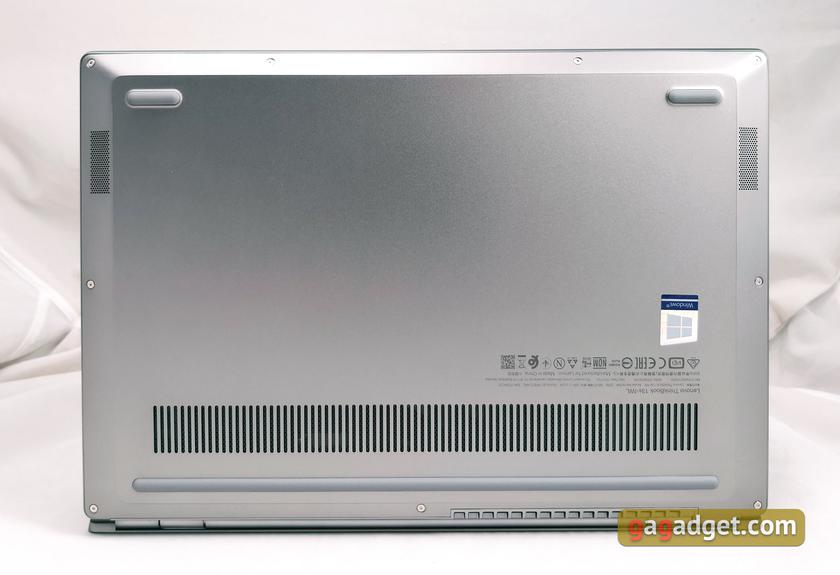 Практически весь корпус ноутбука сделан из металла (пластиковая только панель экрана) спокойного серого цвета с матовым покрытием. На нём практически не видны никакие следы использования, отпечатки пальцев не остаются, ноутбук не надо постоянно протирать для поддержания презентабельного вида. На верхней крышке — только логотипы Lenovo и линейки ThinkBook: