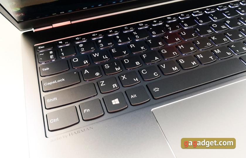 Кнопки типичной для ноутбуков Lenovo формы, удобные, с в меру мягким, приятным, ощутимым и информативным ходом. Есть белая подсветка клавиатуры с двумя уровнями яркости. Клавиатура влагозащищённая, что явно будет приятным бонусом для любителей пролить чай. Заявлено, что на клавиатуру можно безболезненно пролить до 60 мл жидкости: