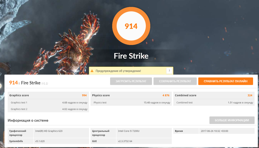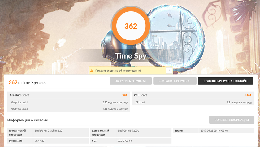 Интегрированный видеоускоритель Intel HD Graphics 620 работает на частоте 300 МГц и способен разгоняться до 1000 МГц. В ноутбуке установлено 8 ГБ оперативной памяти LPDDR3 с частотой 1833 МГц, базовая версия будет оснащена 4 ГБ, в топовой установлено 16 ГБ. Беспроводные модули: двухдиапазонный Wi-Fi 802.11 a/b/g/n/ac 2х2 и Bluetooth 4.2. Железа ультрабука хватает на комфортную работу в офисном режиме. Никаких тормозов при работающем Photosop, открытых 20+ вкладок в Chrome и параллельном проигрывании музыки не наблюдалось. Для игр ультрабук не предназначен, но из интереса запускал World of Tanks, вполне играбельно, при низких настройках выдавалось около 50-60 кадров в секунду: