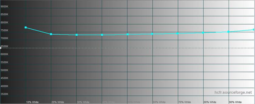Замеры с помощью колориметра показали неплохие цифры: максимальная яркость — 283.771 кд/м2, яркость черного поля — 0.332 кд/м2, а контрастность — 855:1. Экран откалиброван очень хорошо: есть небольшой недостаток красного и переизбыток синего, в результате экран чуть уходит в холодные оттенки. Цветовая температура около 7500K, погрешность ΔE колеблется от 2 до 8: