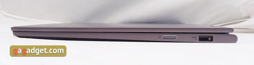 Несмотря на не рекордные габариты и толщину в том числе, разъёмов не так много, как хотелось бы. Полноразмерный USB 3.0 есть, но он только один на правом торце. Рядом — продолговатая кнопка включения со светодиодом по периметру: