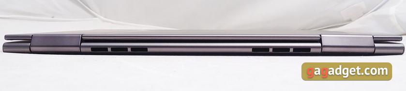 Верхняя крышка крепится двумя в меру широкими шарнирами абсолютно стандартного для такого формата ноутбуков вида. Рядом с ними — по три симметричные прорези для системы охлаждения ноутбука: