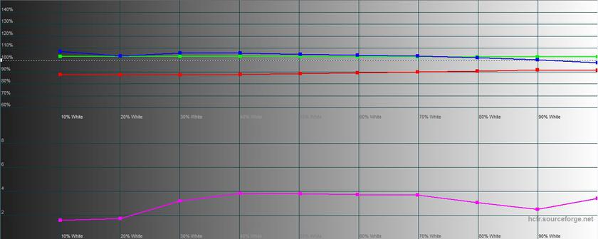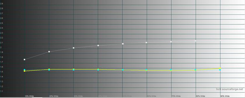 В режиме "фото" максимальная яркость ощутимо ниже 288.269 кд/м2, минимальная — 0.924 кд/м2, а показатель контрастности — 312:1. В целом, графики схожи, но гамма-кривая не настолько радикально отличается от эталонной: