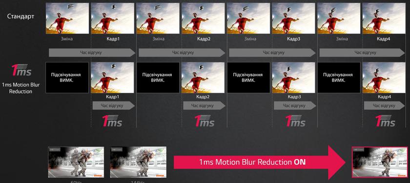 LG акцентирует внимание на функции Motion Blur Reduction, при включении которой время отклика составляет 1 мс, на сайте наглядно показано, как она работает. Фактически, через один вставляется черный кадр (кратковременное отключение подсветки), благодаря чему убирается размытие объекта. Функция не работает одновременно с AMD FreeSync и Dynamic Action Sync: