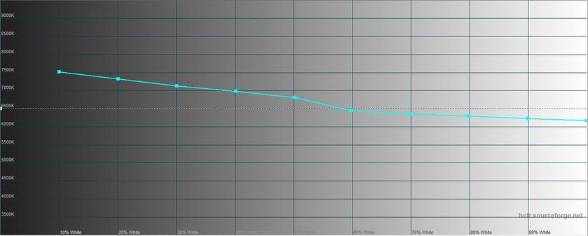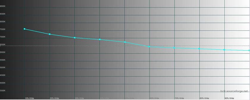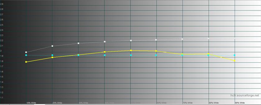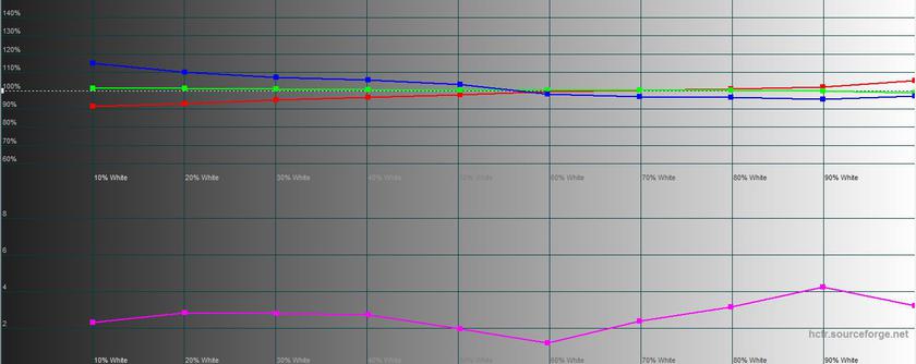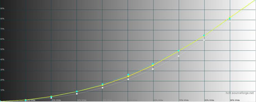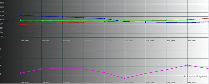 В режиме чтения "режется" синий, картинка становится тёплой, а максимальная яркость ощутимо снижается. Максимальная яркость 218.977 кд/м2, яркость чёрного поля 0.249 кд/м2, а контрастность 879:1: