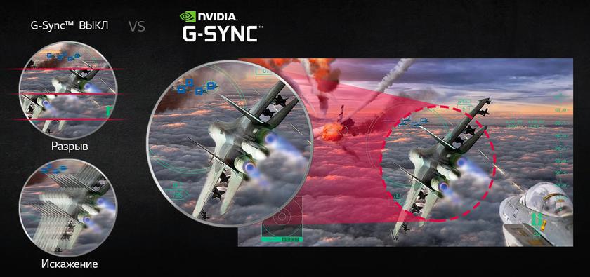 Основными фишками монитора являются матрица 144 Гц и поддержка G-Sync, которая пригодится владельцам актуальных видеокарт GeForce. Если не в курсе, что это, то вкратце: G-Sync — это технология синхронизации кадровой частоты монитора и видеокарты, которая позволяет избежать искажений и разрывов картинки. Реализована она за счёт отдельного модуля разработки Nvidia в самом мониторе. В первую очередь, она будет крайне полезна при использовании не слишком быстрой видеокарты, которая способна "вытягивать" современные игры на не слишком высокой кадровой частоте. Но наличие G-Sync совсем не значит, что с Radeon монитор нельзя использовать. Существуют определённые ограничения человеческого зрения и если ваша видеокарта "вытягивает" высокую кадровую частоту (а в данном случае этот показатель может быть до 144 ГГц), то вы просто физически не сможете заметить какие-либо разрывы/артефакты картинки.