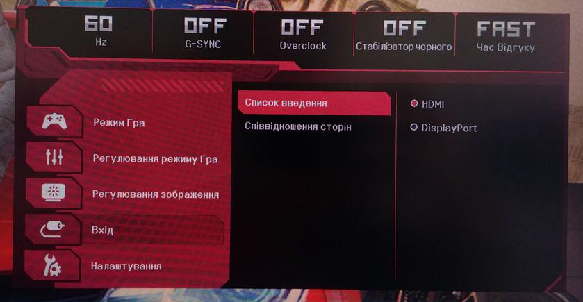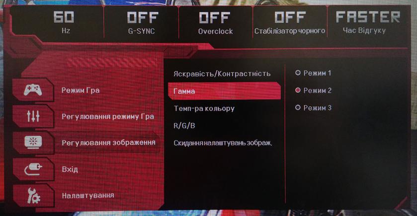 Логика управления и настройки монитора не изменилась по сравнению с прошлыми моделями LG, которые бывали у нас на обзорах, по большей части сменился внешний вид и цветовая гамма меню: теперь в чёрно-красных цветах, с намёком на игровую направленность. По-прежнему все манипуляции производятся с помощью пятипозиционного джойстика. При первом клике на джойстик появляется экранное меню быстрых настроек, из которого можно переключать источник сигнала, режим работы монитора, перейти к настройкам монитора, либо просто его выключить. В режимах отображается кадровая частота, активность G-Sync, Overclock, стабилизатора чёрного цвета и скорость отклика. В расширенном меню есть куча дополнительных настроек, в том числе режим работы USB-портов и тонкая настройка картинки по R/G/B. Помимо четырёх предустановленных режимов (в которых доступны не все настройки) есть два пользовательских, которые можно полностью настроить под свои предпочтения: