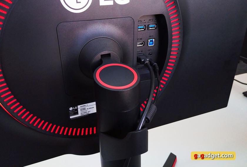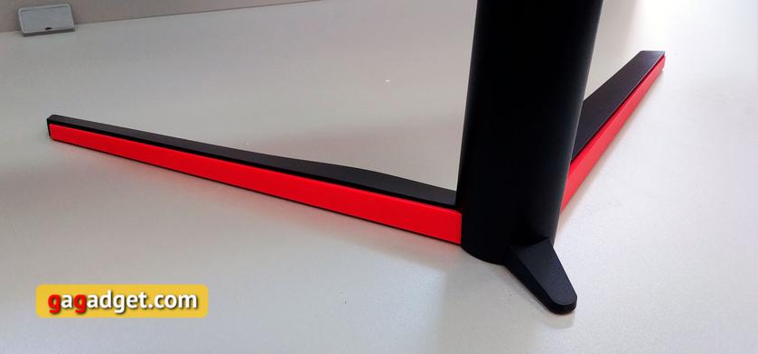Ножка вставляется в соответствующее квадратное углубление и защелкивается, на самой ножке есть декоративная красная вставка круглой формы, выше — большой логотип LG, а вокруг — подсвечиваемая окружность и декоративная красная сетка: