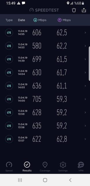 Скорость передачи мобильного интернета в тестовой лаборатории Turkcell на Samsung Galaxy S10. В реальной работе, конечно, таких скоростей нет, но в лаборатории сейчас тестируют уже гигабитные скорости, используя агрегацию частот, доступных в 4G.