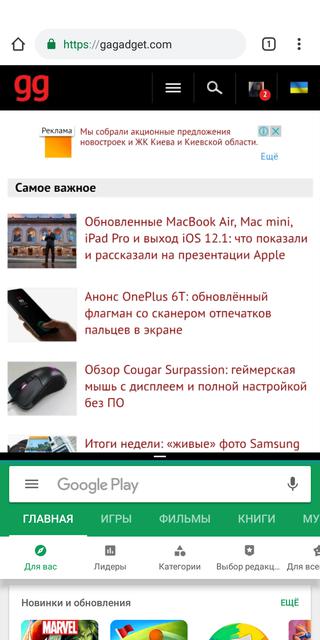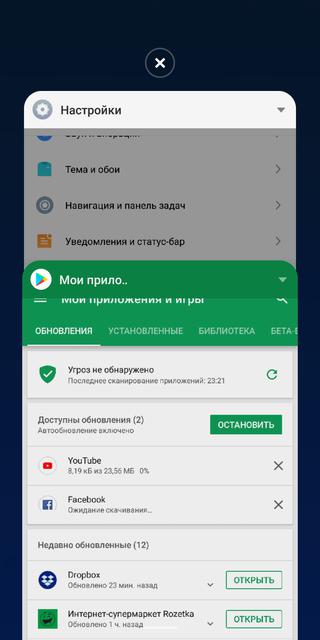 Диспетчер приложений сделан в виде вертикальных или горизонтальных карточек. Можно закрывать сразу все, отдельные, нужные закреплять или скрывать. Поддерживается регулируемый двухоконный режим: