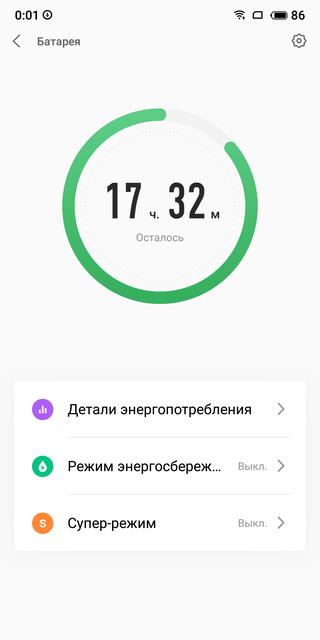 Питается смартфон от далеко не рекордного по ёмкости аккумулятора на 3010 мАч, поддерживается фирменная быстрая зарядка mCharge. На деле, всё вполне в пределах разумного: смартфон без проблем выдерживает день очень интенсивного использования с обилием фоток, бенчмарков и игр. При более умеренном использовании — полтора дня. Не рекордные показатели, но и не хуже конкурентов. Есть собственные режимы энергосбережения, вплоть до сурового, с монохромным отображением, без GPS, Bluetooth и так далее: