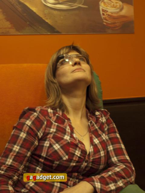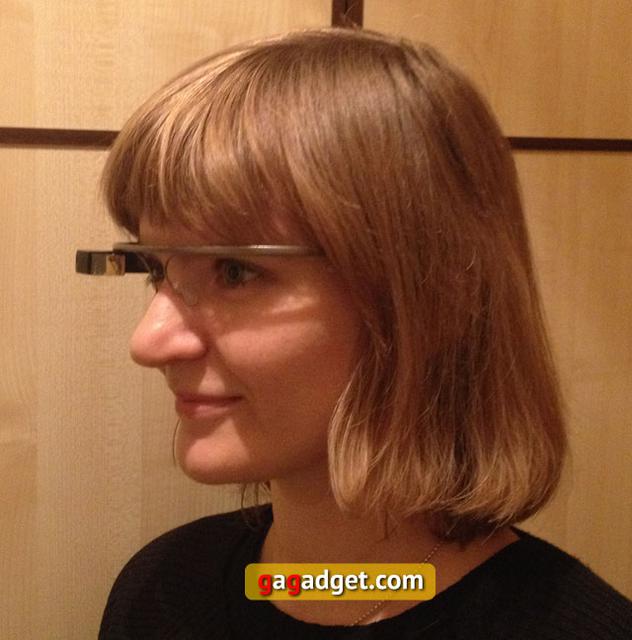 Будут ли последствия в виде косоглазия или смещения фокуса? Не могу сказать, но один любопытный казус, произошедший со мной, заставил об этом задуматься. Я долго сидела и игралась с очками, потом сняла их и пошла к выходу из помещения. Так вот, я попыталась пройти сквозь стеклянную дверь, не открывая ее, поскольку абсолютно ее не заметила! Не скажу, что в задумчивости со мной такого быть не может, но я была крайне удивлена, вписавшись в стекло, поскольку на тот момент мои мысли были заняты именно процессом выхода из помещения и дальнейшим путем, никакой особой глубины. Не знаю, совпадение ли это, или действительно глаза не успели перестроиться после «общения» с экранчиком Google Glass. Кстати, если человек станет лицом к лицу носителя Google Glass, он, приглядевшись, сможет увидеть экранчик в зеркальном отражении.