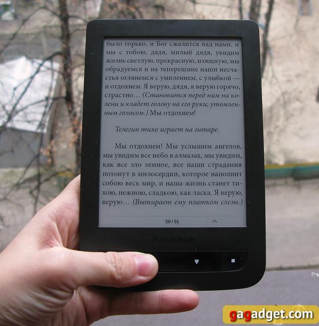 Экран показался достаточно контрастным. Никаких проблем при достаточном освещении (а подсветки здесь нет) с чтением не возникало, антибликовое покрытие неплохое. Хотя при прямом сравнении с Nook Simple Touch, Sony PRS-350 или Sony PRS T2,дисплей несколько проигрывал по контрастности. Фон показался чуть более серым, но не настолько, чтобы это составило недостаток. Это с одной стороны. С другой стороны, моя версия Nook оснащена подсветкой, и стоит примерно столько же. Однако есть у экрана Basic Touch и большое преимущество перед соперником: поддержка мультитач. Скажете, не слишком-то и нужно? Возможно, но мне очень понравилась возможность менять шрифт без вхождения в меню, а просто сводя или разводя два пальца на экране.