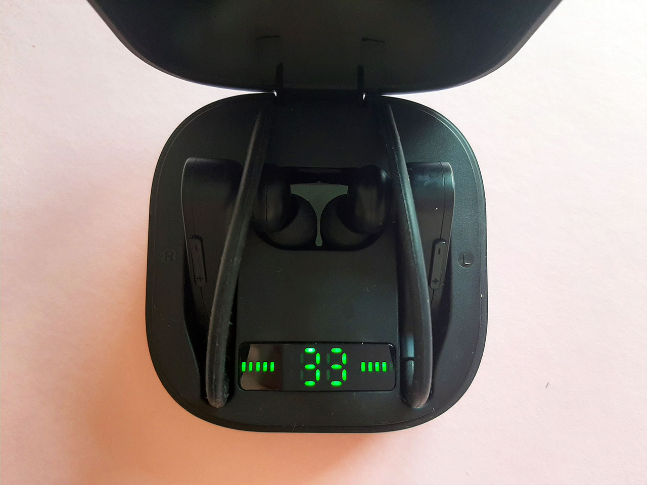 Внешний вид Mixcder T2 — это минус эстетика, плюс эргономика. Наушники сопровождаются огромным пластиковым кейсом (даже больше чем у Sony WF-1000MX3), в котором, помимо «ушек», остается еще много свободного пространства. Зато в нем нашлось место под диодный экран, который огромными цифрами показывает процент заряда кейса. Да и батарея в него помещается немаленькая, на 50 часов подзарядки.