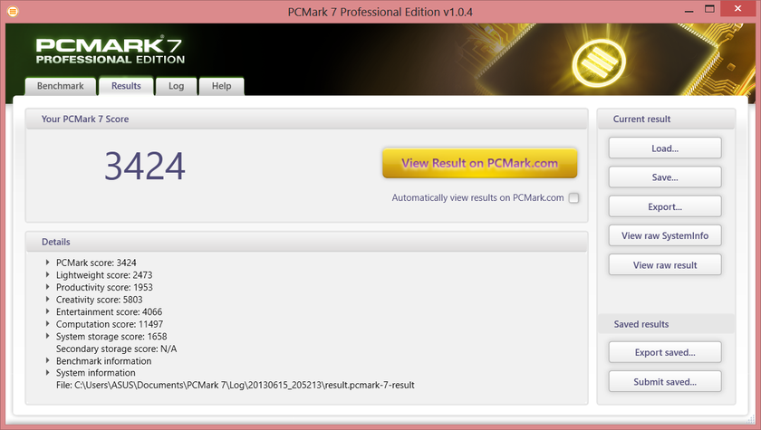 Операционная система Windows 8 летает, приложения загружаются быстро. Согласно тесту Windows 8, все показатели высоки, от 7.6 до 7.9 баллов… Но результирующая все равно 5.9, поскольку здесь в качестве накопителей используются не SSD, а механические жесткие диски Hitachi 72757 по 750 ГБ каждый. Согласно спецификациям, в продаже появится точно такая же модель, в которой помимо винчестеров будет еще и SSD, на который будет установлена операционная система. Думаю, это резонно. Тем не менее, ноутбук и в таком виде работает быстро, что потверждает и PCMark 7, выставивший ему 3424 балла.