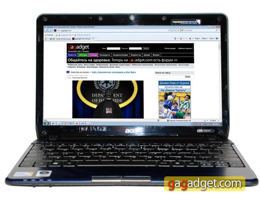 Экрану у ноутбука, по ощущениям, ничуть не отличается от модели Aspire One 751. Он глянцевый и маркий. Не советую касаться его пальцами — вытереть разводы потом крайне сложно и смотреться они будут неэстетично, то же самое касается и маркой поверхности вокруг дисплея. Углы обзора не выдающиеся, но смотреть кино (16:9 не зря все же) вдвоем-втроем будет вполне комфортно. Вообще, если говорить о разрешении 1366х768, то мне иногда не хватает высоты для просмотра сайтов, но это не в пример больше надоевшего уже разрешения 1024х600 у всех поголовно нетбуков, и для 12-дюймовых моделей его можно назвать оптимальным. Делать разрешение экрана выше уже нет особенного смысла (при всей моей любви к высокому разрешению), поскольку это приведет к тому, что текст перестанет быть читаемым и потребует (как, например, в случае с Sony Vaio P) установки в настройках системы шрифта в 120-150%.