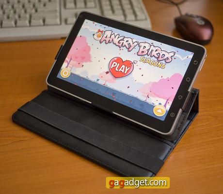 В комплекте с ViewPad 7 поставляется качественный чехол, который складывается и превращается в треугольную подставку, достаточно устойчивую даже для того, чтобы поставить планшет на колени и спокойно печатать на экранной клавиатуре. Однако при этом выход на наушники и разъём USB оказываются на нижней грани устройства, и воспользоваться ими одновременно с подставкой не получится.