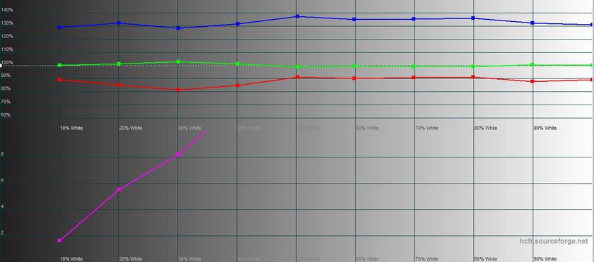 Замеры с помощью колориметра показали в "Обычном" режиме очень приличный запас яркости 416.439 кд/м2, яркость черного поля 0.468 кд/м2 и контрастность 890:1, внушительно, как для модели среднего класса. Оба режима грешат на перебор синего и небольшой недостаток красного, привычная ситуация для большинства современных смартфонных IPS-экранов. Экран слегка уходит в холодные оттенки, цветовая температура колеблется в диапазоне 8500-9000K, а цветовой охват близок sRGB, на диаграмме видно, что есть небольшой недостаток в зеленом и красном: