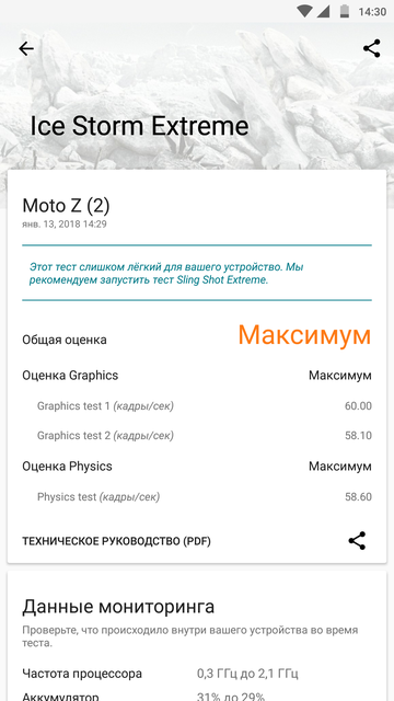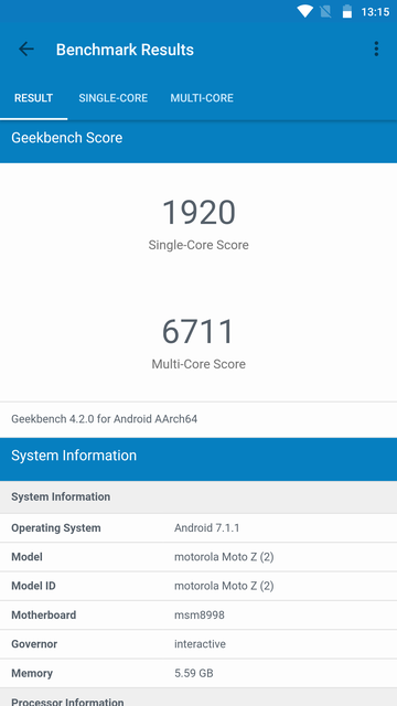 В Moto Z2 Force используется флагманский процессор Qualcomm Snapdragon 835, 6 ГБ оперативной и 64 ГБ встроенной памяти, которую можно расширить с помощью карт MicroSD (вместо второй SIM). Интерфейс летает (тем более, что Moto не использует оболочки, а только несколько своих дополнительных наработок), ровно, как и приложения и игры. При этом ощутимого нагрева корпуса не замечено: