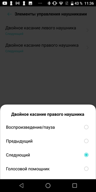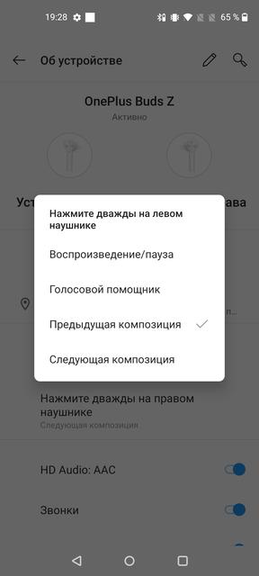Каждый наушник из пары Oneplus Buds Z имеет только один управляющий элемент: круглую сенсорную кнопку. И по загадочной причине он поддерживает только одно действие — двойное нажатие. Почему не используются одинарное и длинное нажатие — непонятно. Да, можно сказать, что одинарное нажатие часто приводит к ложным срабатываниям, а длинное попросту неудобно. Но почему бы не предоставить пользователю возможность самому выбирать, нужны ему такие виды управления или нет? Как бы то ни было, у нас в распоряжении есть двойное нажатие, и на это действие можно назначить одну из команд: воспроизведение/пауза, предыдущий трек, следующий трек, вызов голосового помощника. Причем можно настроить эту функцию отдельно для каждого из наушников. Например, двойное нажатие по левому будет включать предыдущий трек, а двойное нажатие по правому — ставить музыку на паузу или продолжать воспроизведение. Приём телефонного вызова и его завершение тоже выполняются двойным касанием по кнопке (на любом из наушников).