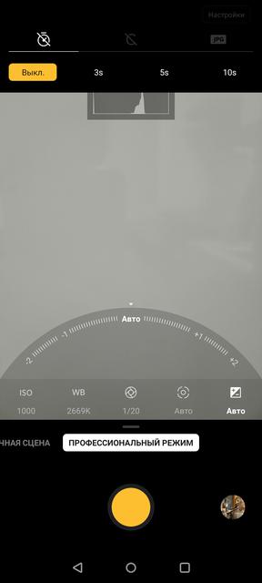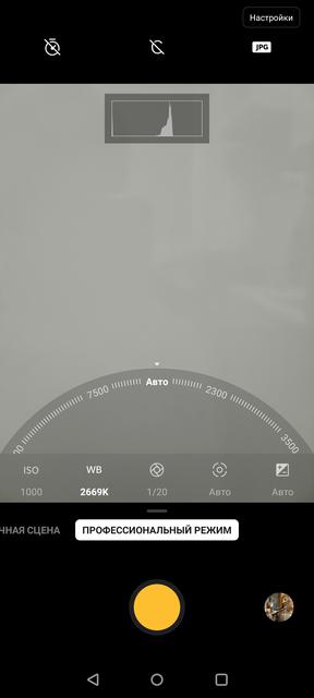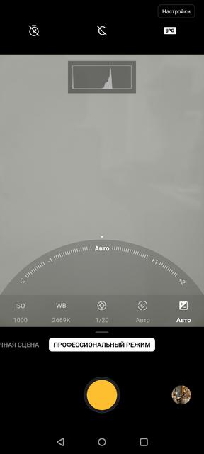 Помимо этих двух, в смартфоне есть режимы «Ночная сцена», «Профессиональный», «Панорама», «Видео», а также режимы замедленной и интервальной съемки (то есть, таймлапса). Переключения между режимами происходят по свайпу вдоль короткой стороны экрана. В профессиональном режиме есть ручная настройка ISO (от 100 до 3200), баланса белого (от 2300 до 7500К), выдержки (от 1/8000 до 30 c) и коррекции экспозиции (от -2 до +2 ступеней). Снимки можно сохранять как в JPEG (16 или 64 МП), так и в RAW, есть визуальный уровень и гистограмма в реальном времени, неплохо! Режим HDR может включаться автоматически при соответствующем освещении или не включаться вовсе, вручную активировать его нельзя.